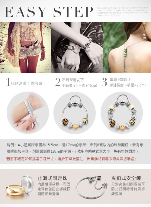 商品規格 商品材質:925純銀。 串珠尺寸:約1.0x1.4cm。 商品配件:原廠包裝盒、商品保證卡、專屬拭銀布。 貼心提醒:此商品為珠飾。如需銀鍊、皮革鍊請另行選購。 體驗說明 使用方法說明 請將珠飾串入手鍊中,再配戴於手腕處即可。 注意事項 我們所提供為全新產品,並提供以下保證: - 保固範圍:新品瑕疵 - 顧客諮詢服務中心:本站客服中心 |